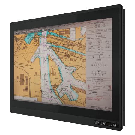 Winmate ECDIS Marine Display Series delivers advanced solutions tailored for marine applications, available in sizes from 15″ to 32″. Designed with edge-to-edge narrow bezels and a fanless cooling system, these displays provide a sleek and reliable performance. Featuring capacitive touch keys and support for ECDIS-compliant DAY, DUSK, and NIGHT modes, they ensure optimal visibility in varying lighting conditions. Certified with IEC 60945 4th Edition, DNV-CG-0339, and IACS E10 standards, the series offers rugged durability, optional color calibration, and multi-touch capabilities, making it ideal for navigation and marine control systems.