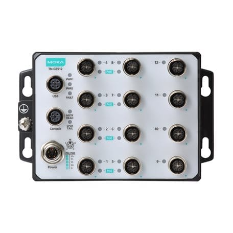 The TN-G6500 Series has push-pull M12 connectors that are tailor-made for push-pull cables in order to facilitate quick installation, and also allow M12 rotary cables to be utilized. The 24 to 110 VDC wide power input range and isolated dual power inputs not only allow you to use the same type of power source at different sites around the globe, but also increase the reliability of your communications system. Furthermore, the -40 to 70°C operating temperature and IP67-rated enclosure allow deployment in harsh environments. The TN-G6512 Series Ethernet switches are compliant with the essential sections of the EN 50155 standard, covering operating temperature, power input voltage, surge, ESD, vibration, power isolation, and includes a model with conformal coating to ensure suitability for a variety of industrial applications.