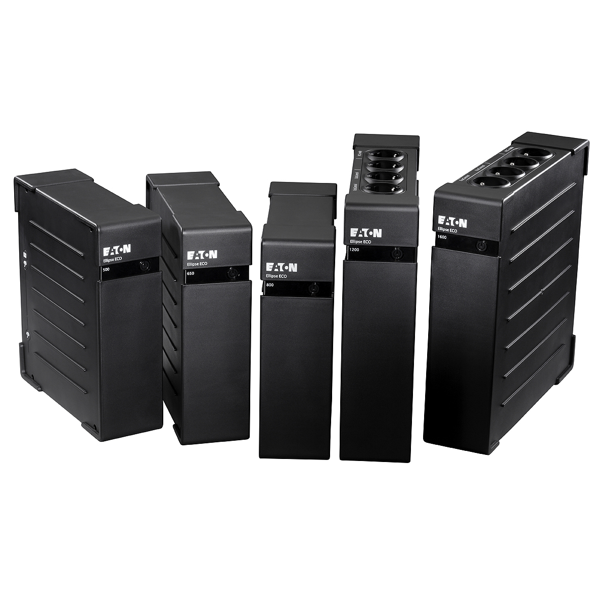 The Eaton Ellipse ECO UPS is a single-phase standby/offline UPS, with power ratings from 650 – 1600 VA. The UPS is available in a tower or rack form factor. The Ellipse ECO UPS includes a high-performance surge protection device in compliance with IEC 61643-1: Low-voltage surge protective devices and line protection for Ethernet, internet, and telephone lines