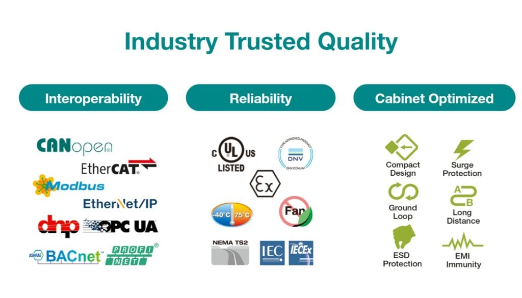 Beyond our service and support, the MOXA products themselves bring proven quality to your control cabinet projects. Here are the key certifications and features: